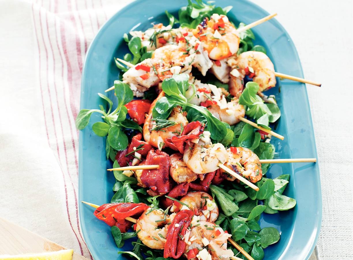 Steek de barbecue aan of verhit de grillpan. Rijg voor de Spaanse variant om en om een garnaal en een plakje chorizo aan 6 spiesen. Houd per spies 2 garnalen aan. Rijg voor de Portugese variant om en om een garnaal en een stukje koolvis.