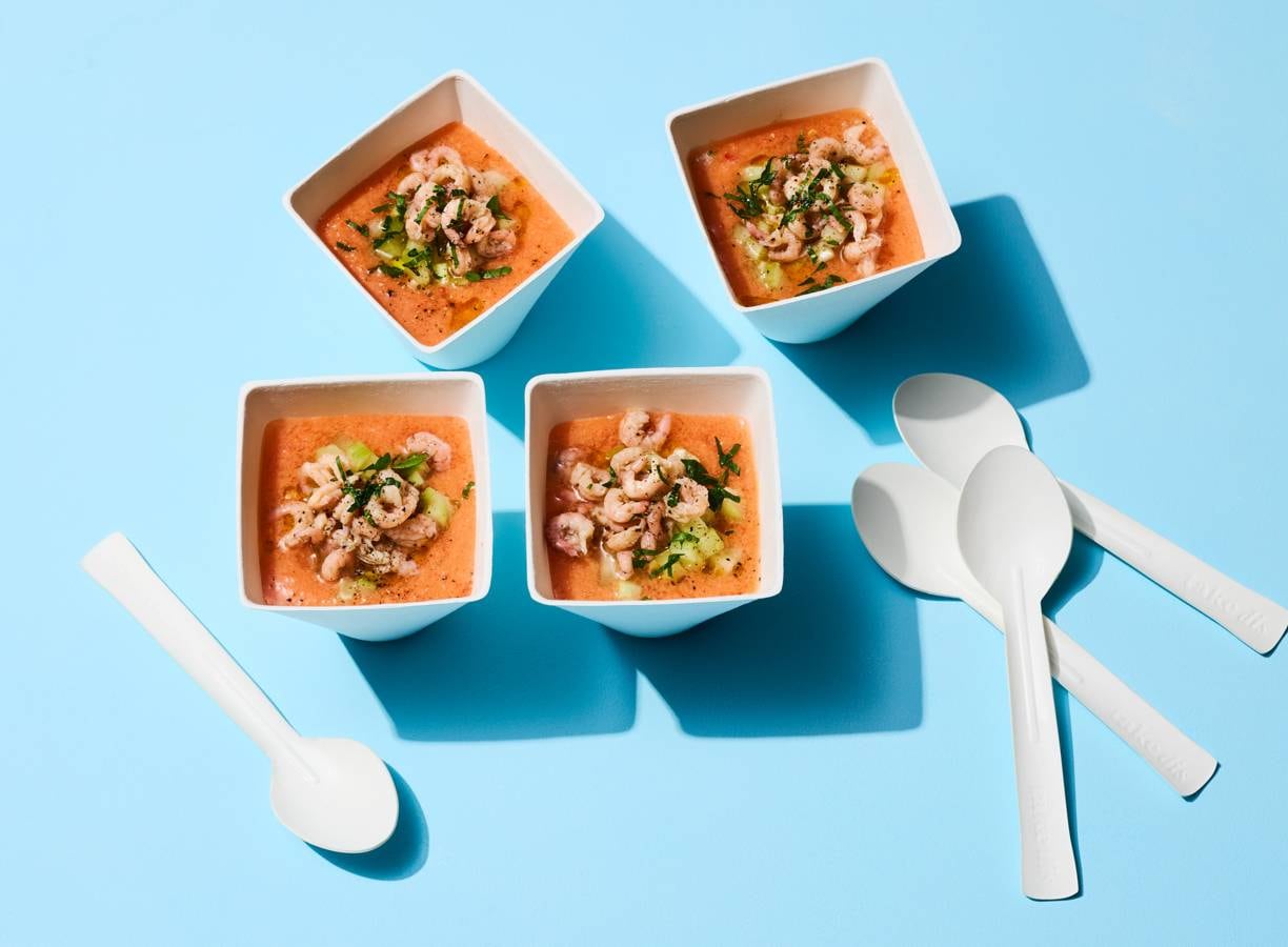 Gazpacho (Spaanse koude soep) krijgt een Nederlands elementje dankzij de Hollandse garnalen. Een fijn voorgerecht met best of both worlds.