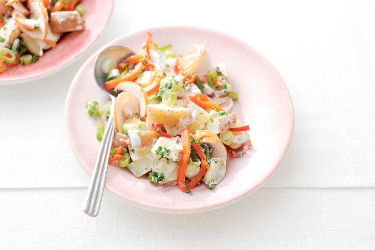 Snijd ondertussen de paprika in reepjes, de bosui in ringetjes en de kipfilet in plakjes. Snijd het steeltje van de rode peper. Halveer de peper in de lengte en verwijder met een scherp mesje de zaadlijsten. Snijd het vruchtvlees in reepjes. Meng de aardappelen met de paprika, bosui, kipfilet, rode peper en peterselie.
