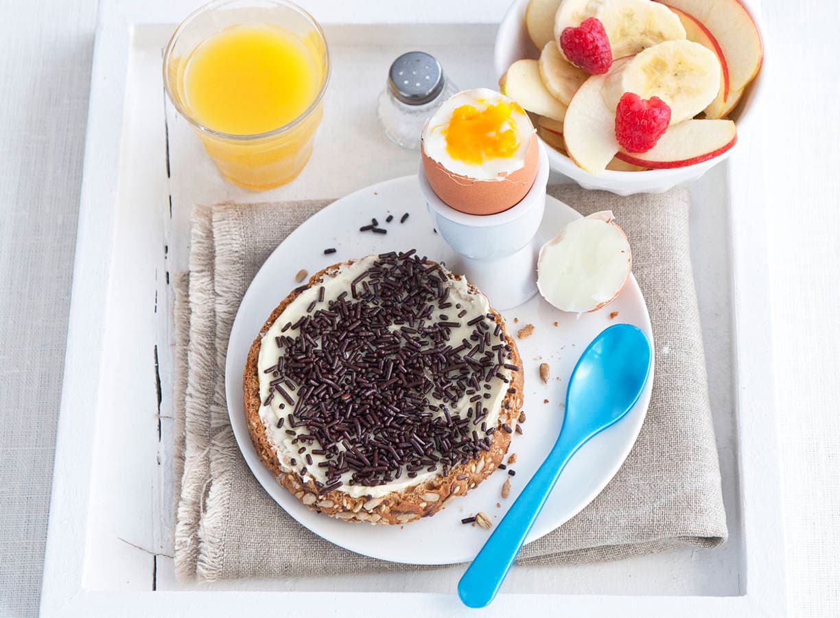 Leg op 4 bordjes een beschuit, besmeer met de boter en bestrooi met hagelslag. Serveer op een dienblad met de fruitsalade en de gekookte eieren.