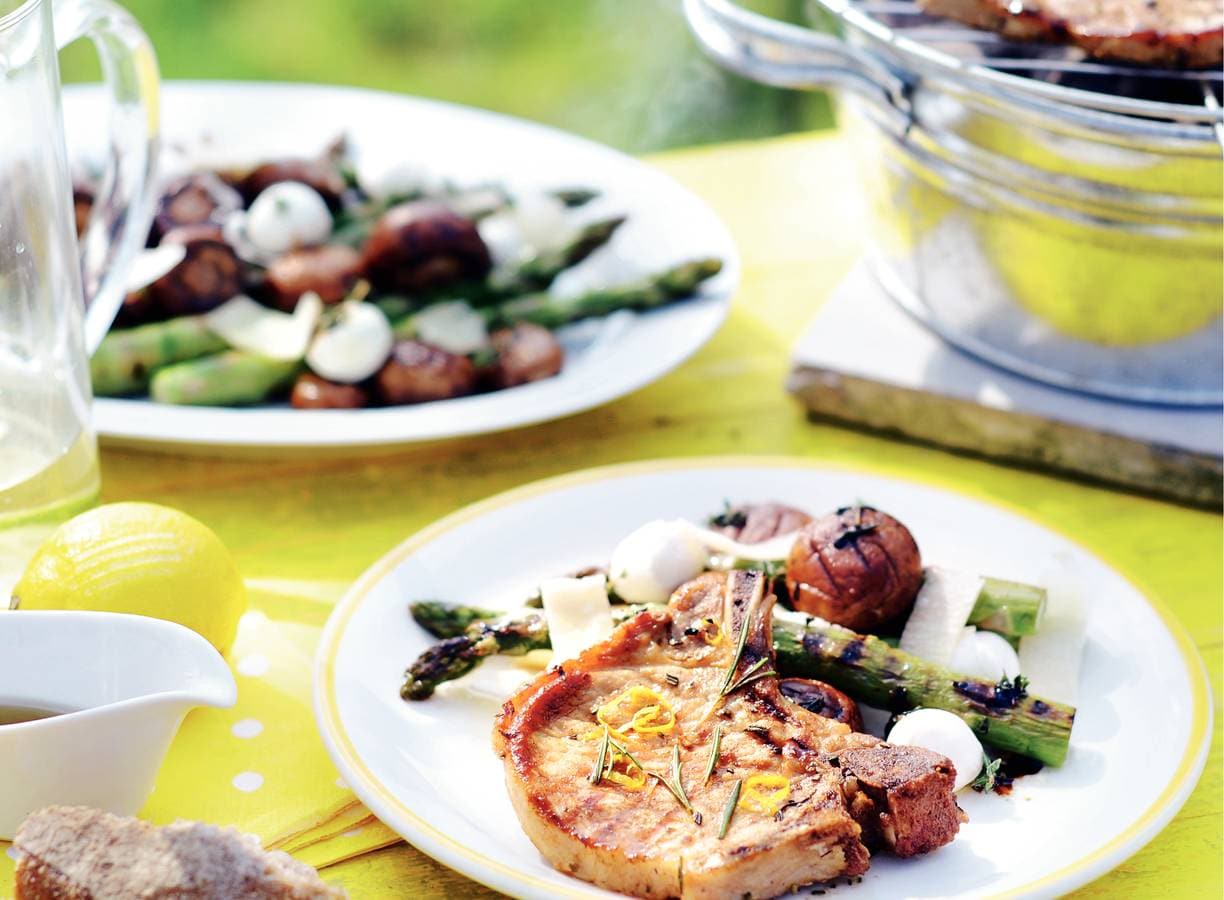 Rijg de champignons aan de satéprikkers en gril ze op de barbecue in 8 min. gaar. Leg na 3 min. de asperges erbij, dwars op het rooster van de barbecue. Laat de champignons even afkoelen en haal ze van de prikkers.