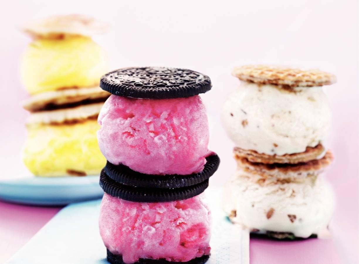 Leg op 4 borden 2 stroopwafels. Schep op elke stroopwafel 1 bolletje roomijs en dek af met telkens 1 stroopwafel. Stapel telkens 2 ijssandwiches op elkaar.