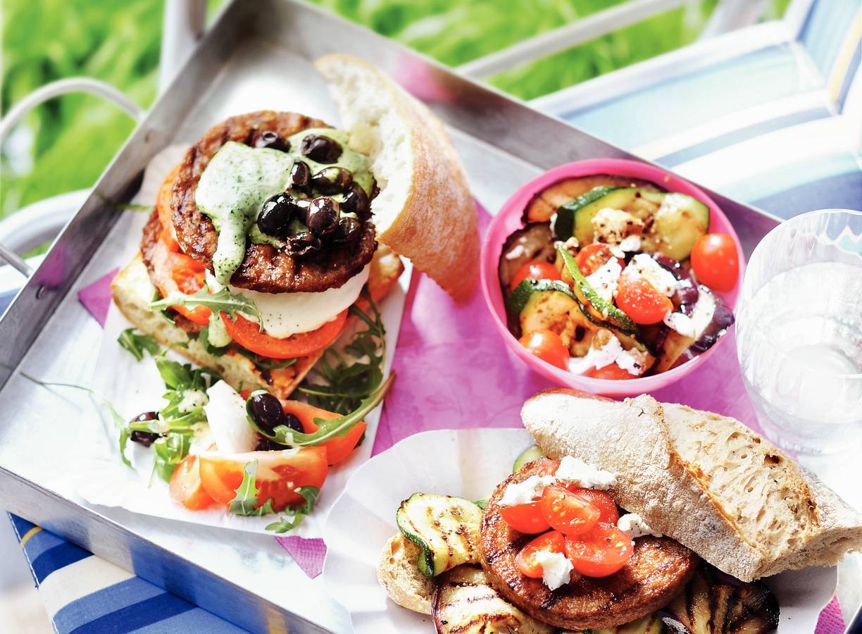 Verhit de grillpan of steek de barbecue aan en gril 4 hamburgers in 3 min. gaar. Keer halverwege. Leg ze afgedekt op een bord om ze warm te houden. Gril de rest van de hamburgers in 3 min. gaar. Bedek 4 hamburgers met een plak mozzarella en 2 plakken tomaat. Dek af met een hamburger. Gril de dubbele hamburgers nog 2 min. Keer voorzichtig na 1 min.