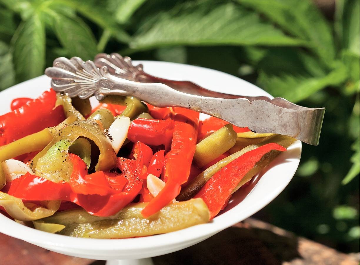 Doe de paprika en knoflook in een schaal en schenk de olie erover. Bestrooi met peper en zout en serveer. U kunt dit gerecht 1 dag van tevoren bereiden, bewaar tot gebruik afgedekt in de koelkast. Serveer op kamertemperatuur.