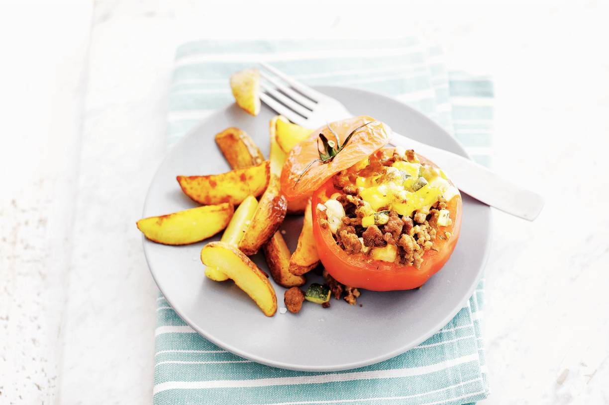 Snijd de bovenkant van de tomaten en schep met een lepel de zaadlijsten eruit. Vul de tomaten met het gehaktmengsel en bestrooi met de kaas. Zet de tomaten tussen de aardappelpartjes in de oven en bak ca. 15 min. mee. Serveer direct.