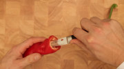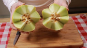 - Halveer de meloen en verwijder de pitjes. Steek met een meloenbolletjeslepel zoveel mogelijk meloenbolletjes uit de helften (zorg ervoor dat de schilhelften heel blijven). Laat de meloenhelften omgekeerd uitlekken.