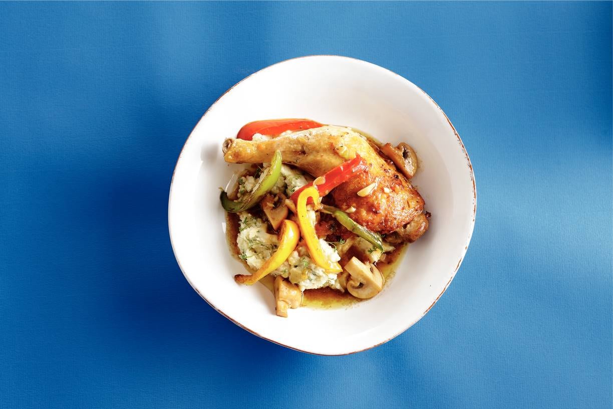 Verwarm de aardappelpuree volgens de aanwijzingen op de verpakking, schep de tuinkers erdoor en serveer met de kip.