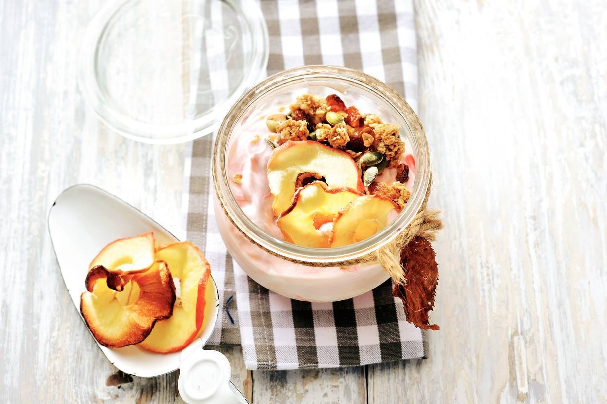 Meng de hangop met het cranberrysap en verdeel over 4 schaaltjes. Meng de muesli met de rozijnen en pompoenpitten en verdeel over de hangop. Leg de appelchips erop en serveer.
