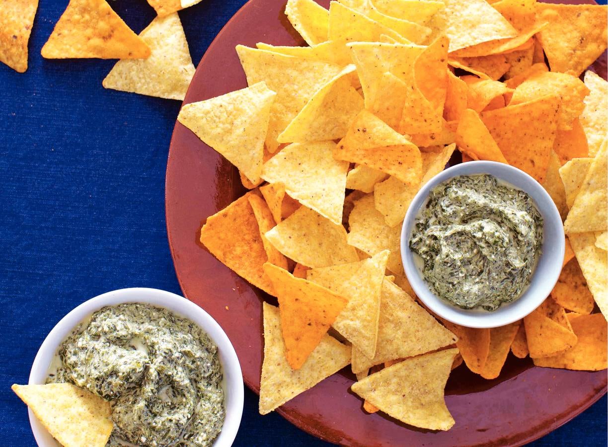 Verhit de olijfolie in een koekenpan. Voeg de spinazie in porties toe en laat al omscheppend slinken. Giet af in een vergiet en pureer de warme spinazie in een keukenmachine of blender samen met de knoflook en koriander. Roer er de zure room en witte kaas door. Breng op smaak met peper en zout. Serveer de dip warm met de tortillachips.