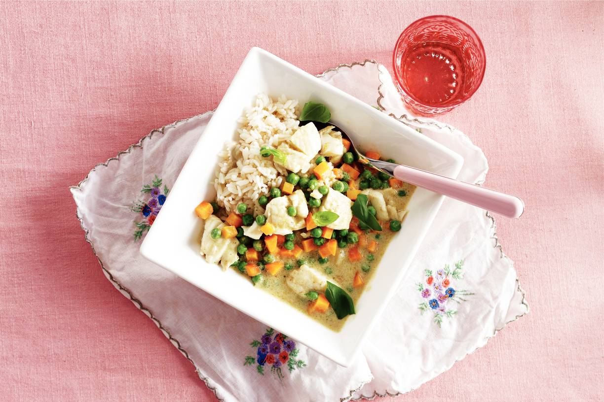 Snijd de vis in stukjes en voeg toe. Laat de curry 5 min. zachtjes doorkoken tot de vis gaar is. Verdeel de rijst over 4 kommen en schep de viscurry erop. Lekker met in stukjes gescheurde blaadjes basilicum. Let op: dit gerecht is erg pittig!