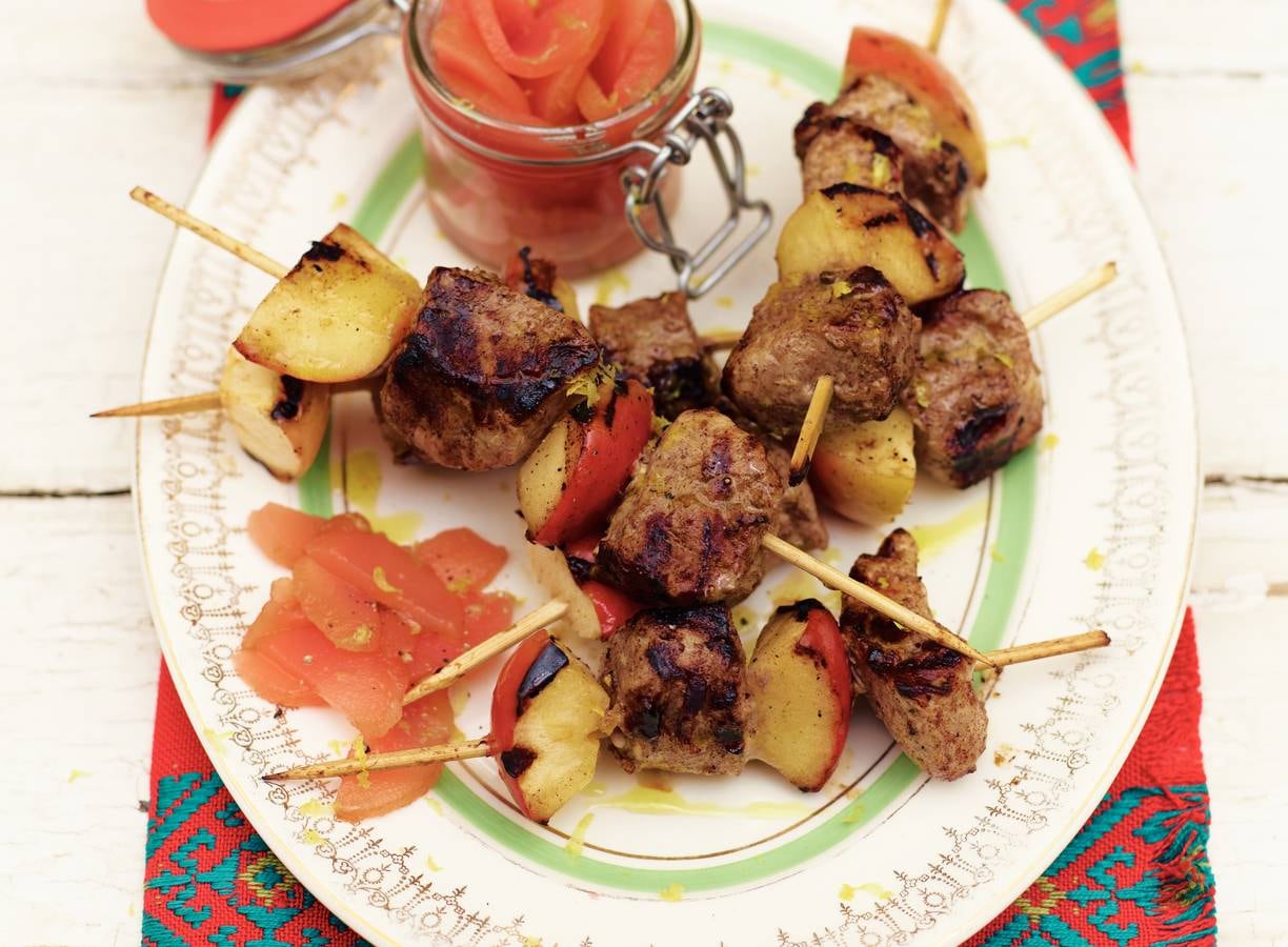 Verhit de grillpan en gril de spiesjes 6 min. Keer halverwege. Leg op een schaal en serveer de peertjes er apart bij.