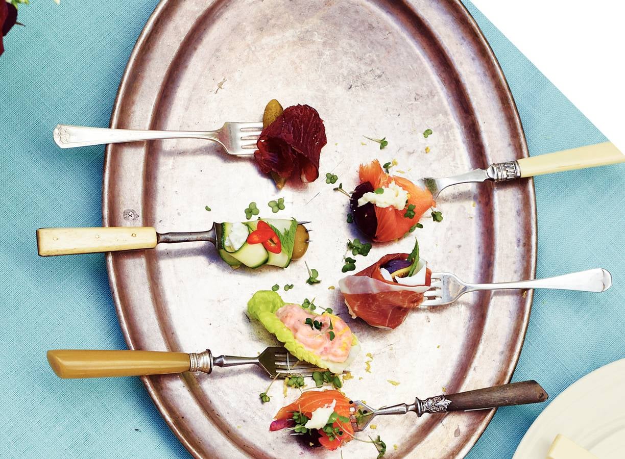 Snijd met een dunschiller of kaasschaaf dunne linten van de courgette. Wikkel 1 stukje kaas, 1 olijf, 1 blaadje munt en rode peper in 2 linten courgette en prik het op een vork. Maak zoveel vorken als u wilt.
