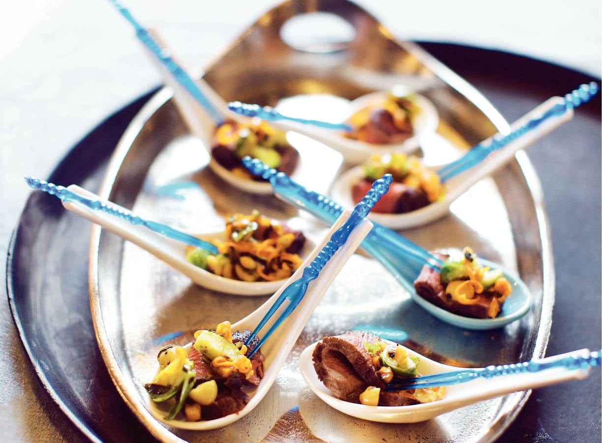 Snijd de biefstukken in dunne plakjes. Verdeel over de lepels en schep de spruitjes met de dressing erop.