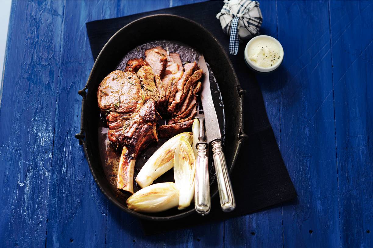 Verhit een koekenpan en bak het vlees in 5-6 min. rondom bruin. Leg in de ovenschaal en bak het vlees in de oven in ca. 45 min. medium. Neem uit de oven en laat 10 min. rusten onder aluminiumfolie.