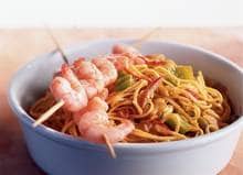 Grill voorverwarmen. Mie koken volgens gebruiksaanwijzing. Van 2 eetlepels olie, citroensap, zout en peper dressing roeren. Garnalen aan 8 spiesen steken en bestrijken met dressing. Garnalen in grill in ca. 5 minuten knapperig roosteren. Halverwege keren en nogmaals met dressing bestrijken. In wok rest van olie verhitten. Groentemix ca. 4 minuten roerbakken. Mix en 1 dl water toevoegen en nog ca. 1 minuut roerbakken. Geheel op zacht vuur ca. 2 minuten laten sudderen. Mie toevoegen en goed mengen. Op smaak brengen met ketjap, zout en peper. Mieschotel over vier borden verdelen. Spiesen er bovenop leggen.