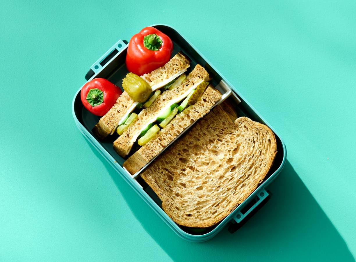 Een dubbeldikke boterham met kip en komkommer, dat is dubbel feest voor de lunch op school!