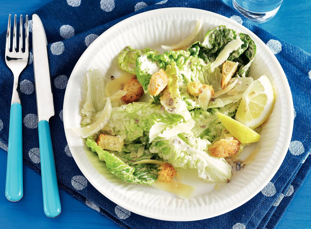 Verdeel de sla over 4 borden. Schaaf de kaas erover en verdeel de croutons over de salade. Serveer met de partjes citroen.