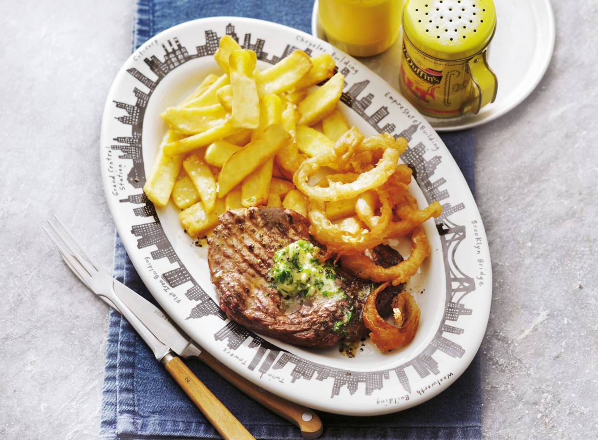 Steak met gefrituurde uienringen