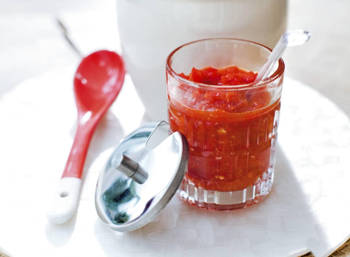 Snijd het steeltje van de pepers. Halveer de pepers in de lengte en verwijder met een scherp mesje de zaadlijsten. Snijd in stukken en doe in het bakje van de staafmixer. Voeg de vissaus, het limoensap, basterdsuiker en de knoflook toe. Maal met de staafmixer fijn tot een pasta. U kunt de sambal 3 dagen van tevoren bereiden. Bewaar afgedekt in een bakje in de koelkast.