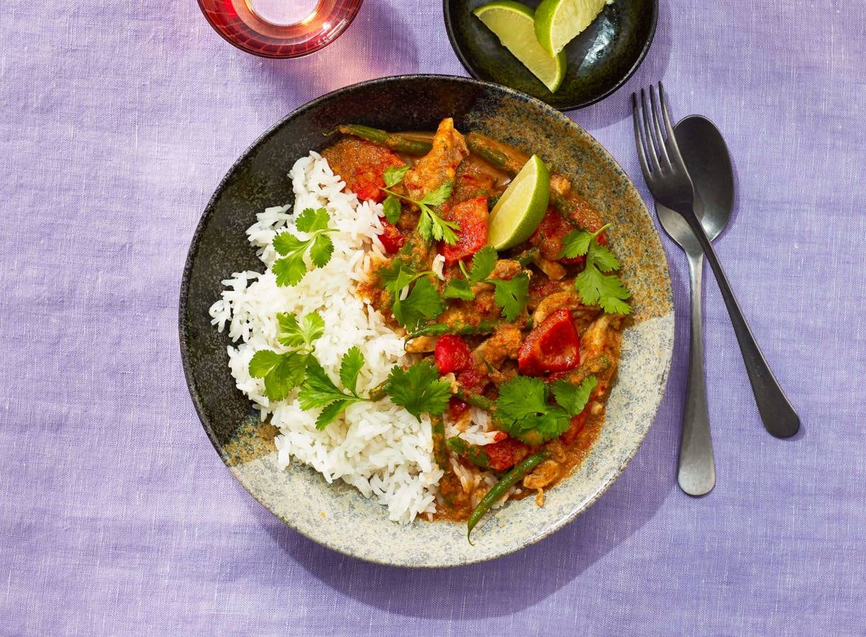 Snijd de sperziebonen en paprika in stukken van 3 cm. Voeg toe aan de curry en kook nog 6-8 min. Boen de limoenen schoon. Rasp vlak voor het serveren de groene schil van de helft van de limoen erboven, pers de vrucht uit en breng de curry op smaak met het limoensap. Serveer met de rijst, koriander en de rest van de limoen in parten ernaast. Garneer de curry met de achtergehouden korianderblaadjes.