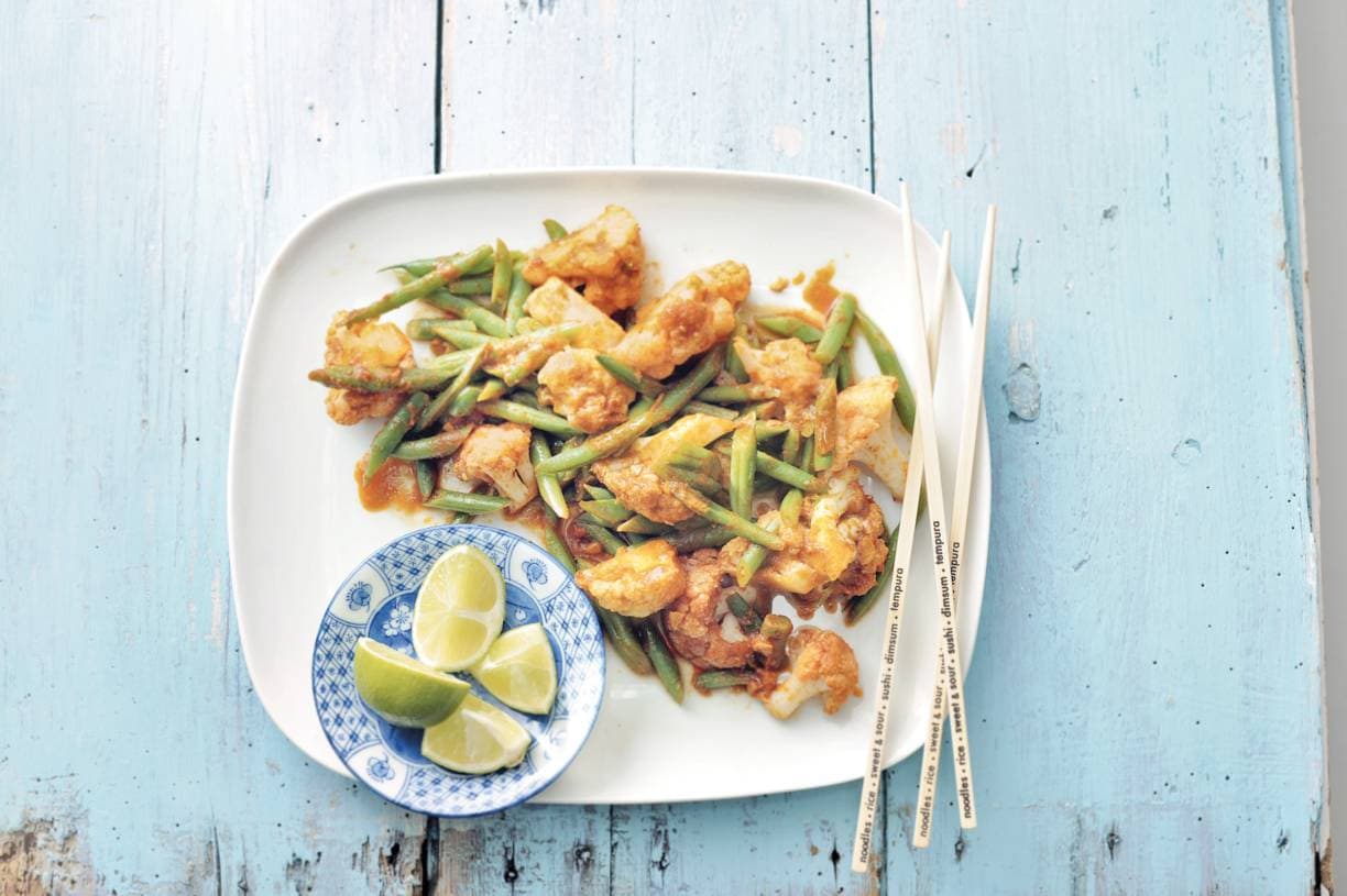 Snijd de sperziebonen in schuine stukken. Kook samen met de bloemkool 3 min. Giet af in een vergiet en laat uitlekken.