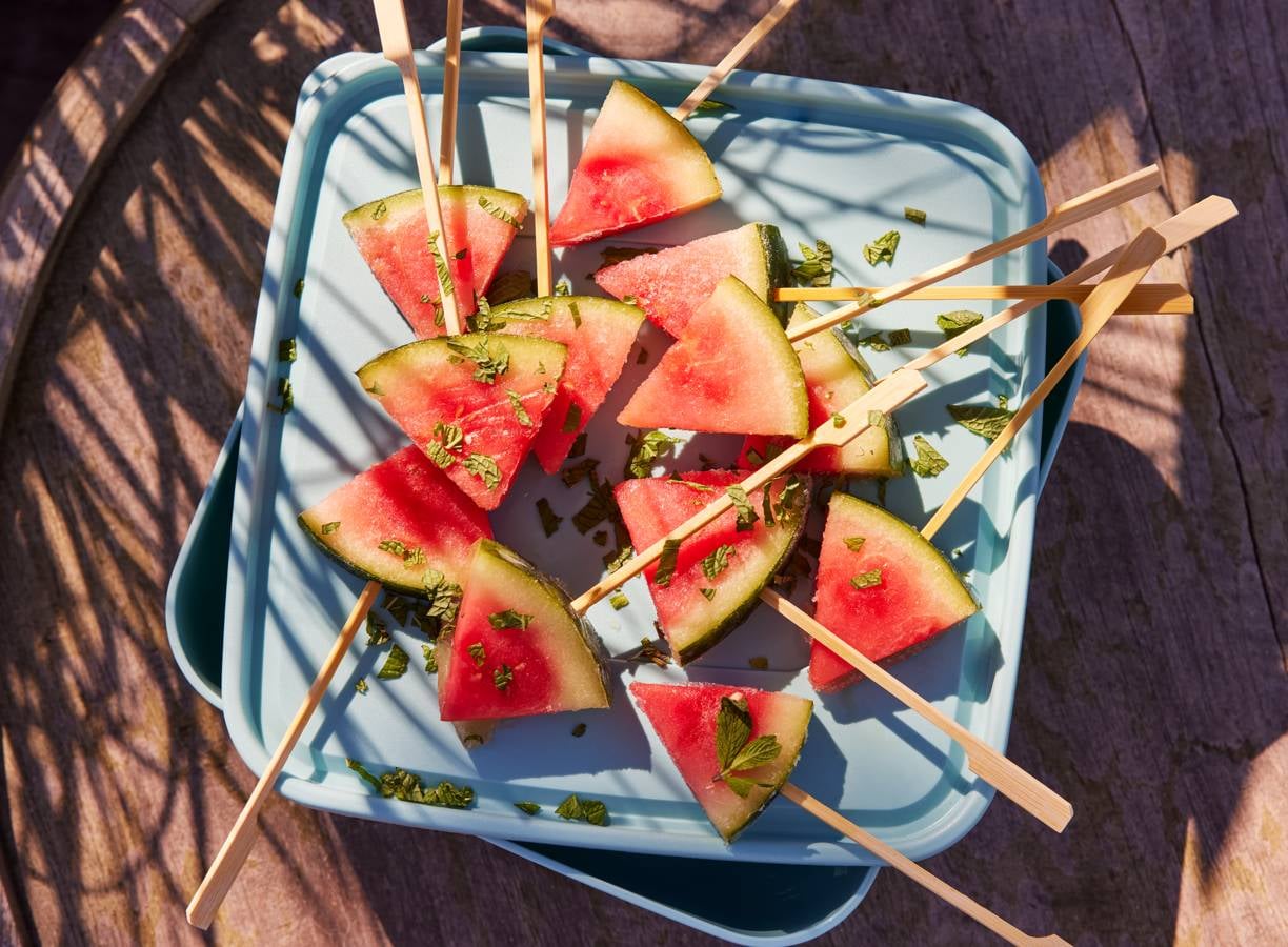 variatietip:Picknick je in je eigen tuin? Je kunt van de watermeloenlolly’s ook ijsjes maken. Leg de meloenprikkers hiervoor 1 uur in de vriezer.