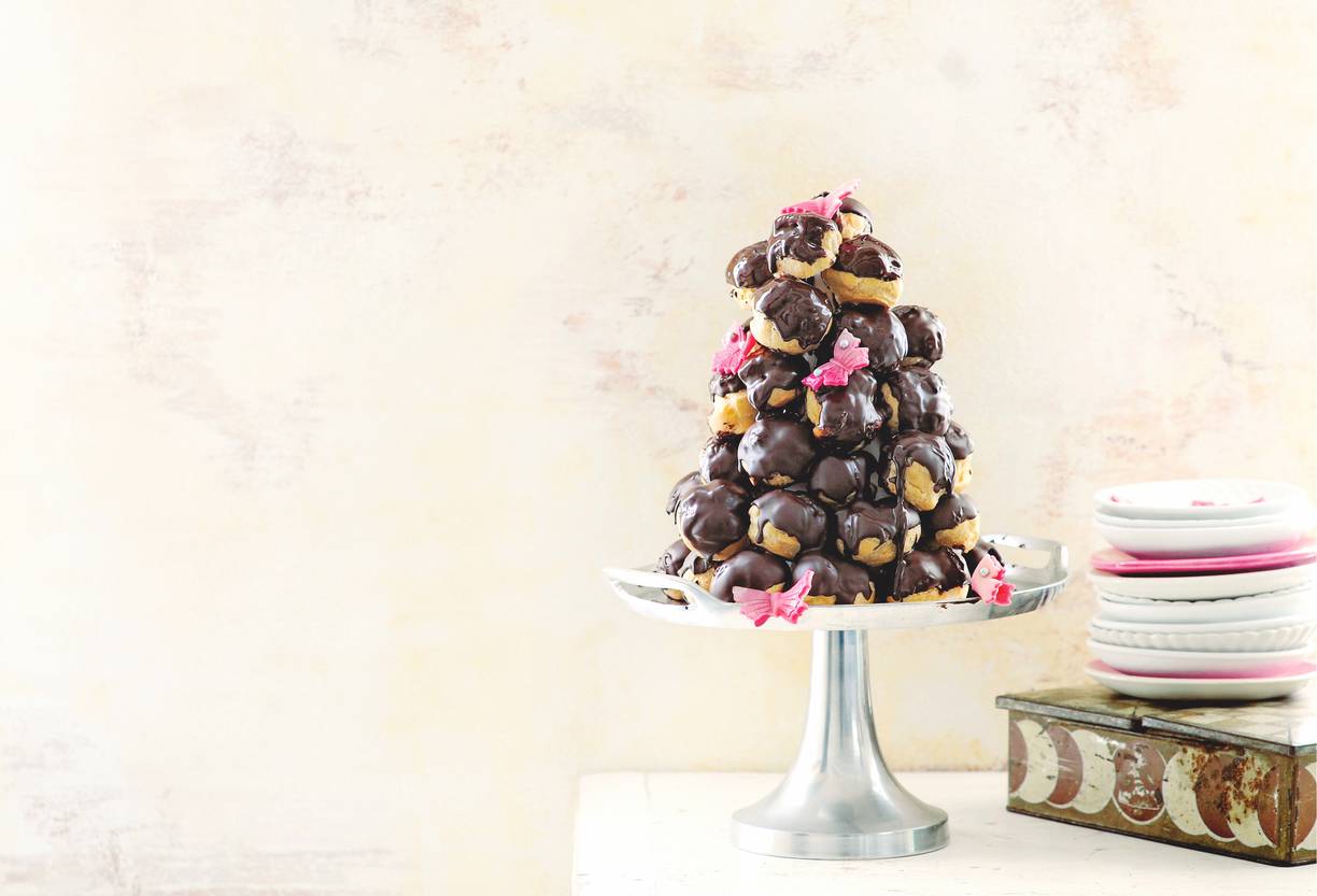 Bijna te mooi om op te eten, deze soezenstapel met chocolade, slagroom en marsepein