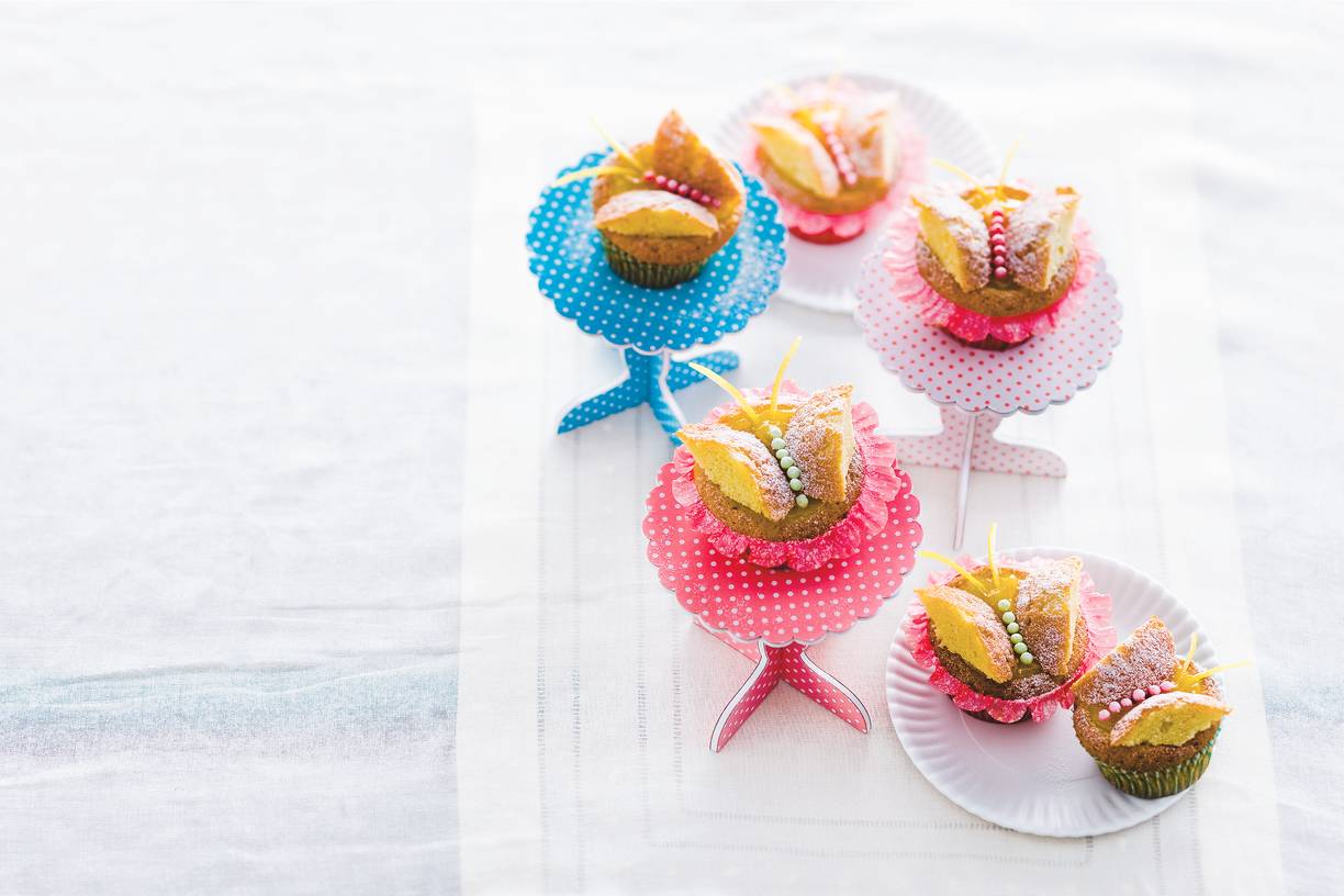 Steek met een scherp, puntig mesje vanaf 1 cm van de rand van de cupcake schuin naar beneden naar het midden van de cupcake. Snijd een kegelvormig kapje uit de cupcake. Vul de opening met lemon curd. Halveer het uitgesneden kapje en zet het weer op de cupcake met de ronde kanten tegen elkaar, zodat een vlindertje ontstaat. Herhaal deze handeling bij alle cupcakes. Leg in het midden van de vleugeltjes een rijtje cupcake parels om het lijfje te maken.