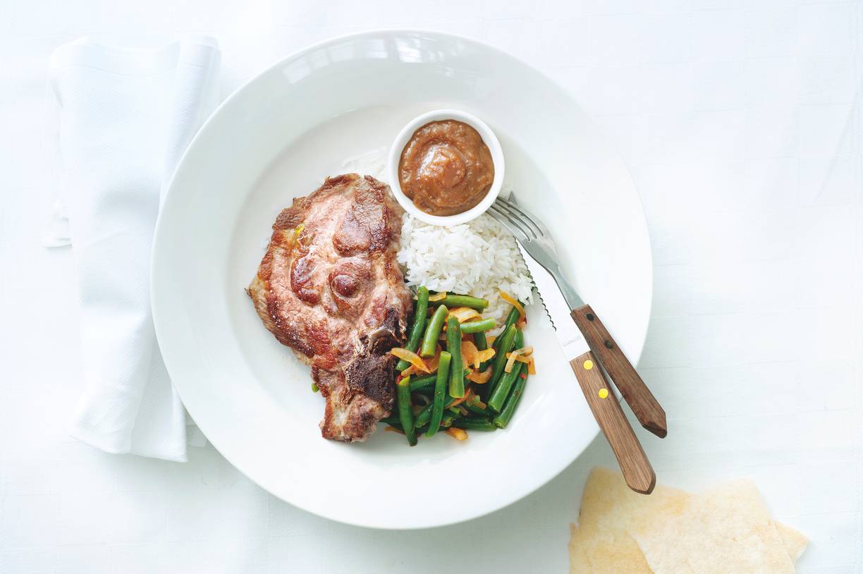Verwarm ondertussen de satésaus volgens de aanwijzingen op de verpakking. Verdeel de karbonades over de borden. Serveer met de rijst, bonen, satésaus en kroepoek..