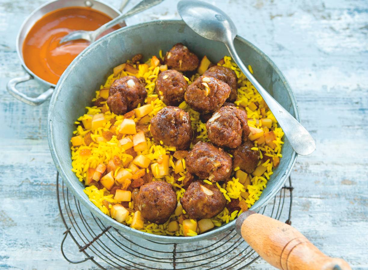 Kruidige gehaktballetjes met pastinaak en gele rijst