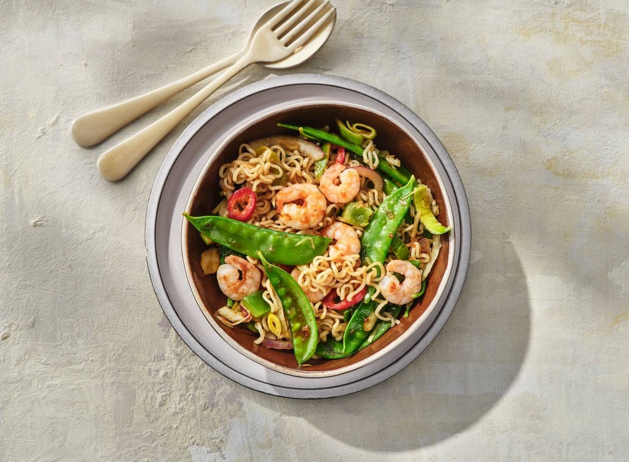 Zin in noedels met pit? Met garnalen, peultjes en een kruidige saus zet je in 20 minuten een bord vol smaak op tafel. Ideaal voor wie houdt van veel smaak op één bord.