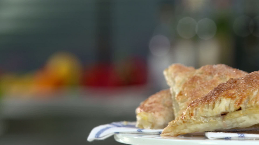 Klop een ei los en bestrijk de randen met de helft van het ei. Vouw het deeg diagonaal dicht en druk met de tanden van een vork de randen aan. Bestrijk de flappen met de rest van het ei en bestrooi met 3 eetlepels fijne kristalsuiker. Bak in ongeveer 25 minuten in het midden van de oven goudbruin en gaar.