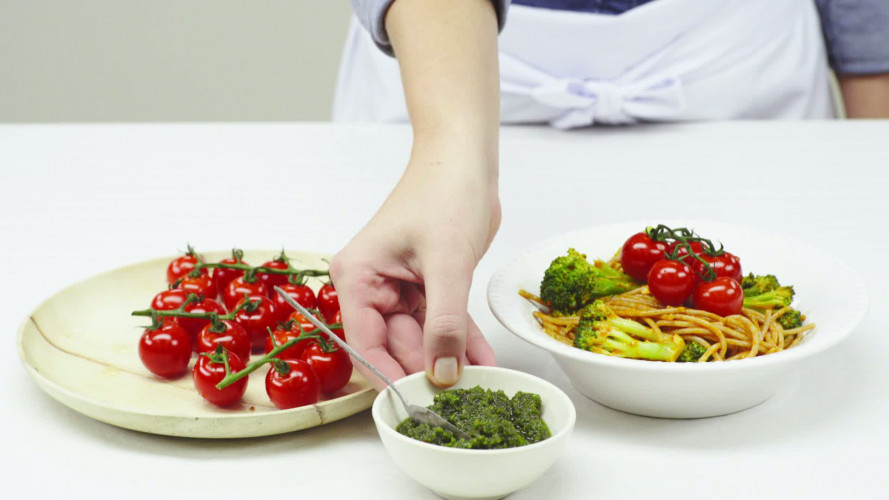 Volkorenspaghetti met amandelpesto, broccoli en tomaten Stap 9.mp4