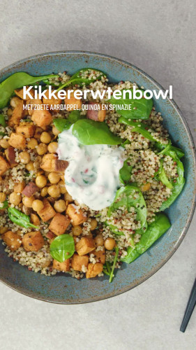 Kikkererwtenbowl met zoete aardappel, quinoa en spinazie