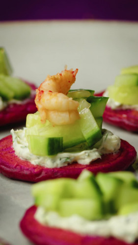 Bietenblini's met dille-crème fraîche en rivierkreeftjes