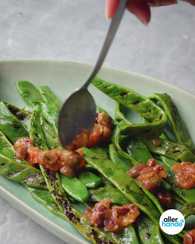 Salade met gegrilde snijbonen, tomatendressing en pistache