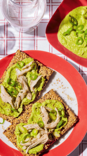 Cracker met avocado-spinazie zuivelspread, makreel en bosui
