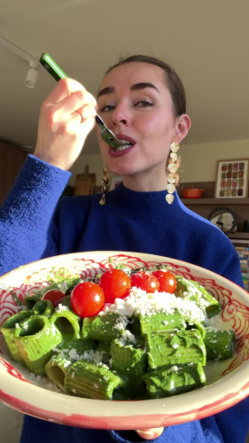 Pasta pesto met cottagecheese van Veggilaine